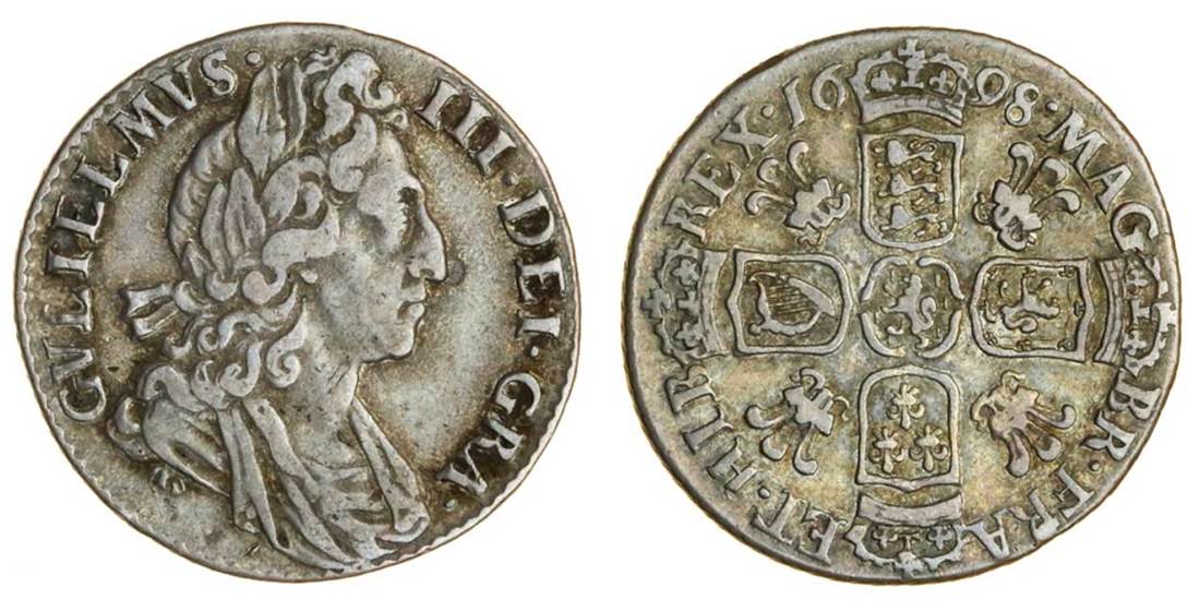 William III (1694-1702), Sixpence, 1698, third bust right, rev. crowned cruciform shields, plumes in angles, lion of Nassau at centre (ESC 1244 (1575); S.3546), nearly very fine, rare