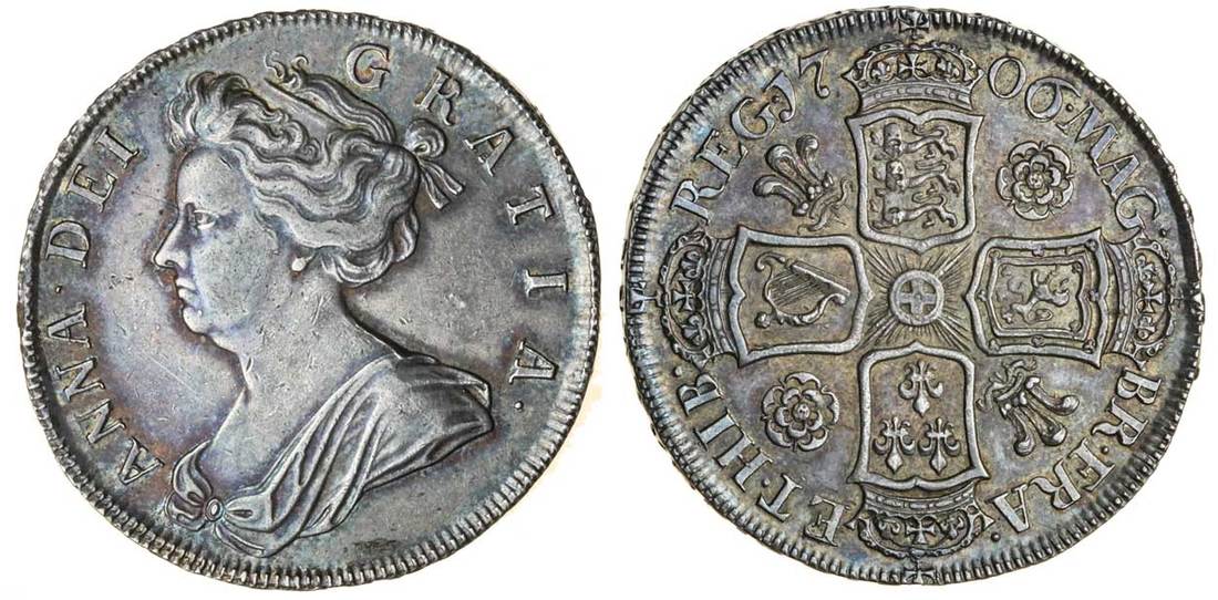 Anne (1702-1714), Halfcrown, 1706 qvinto, draped bust left, rev. crowned cruciform shields, roses and plumes in angles, Garter star at centre (ESC 1361 (572); S.3582), toned, very fine, the reverse better, scarce