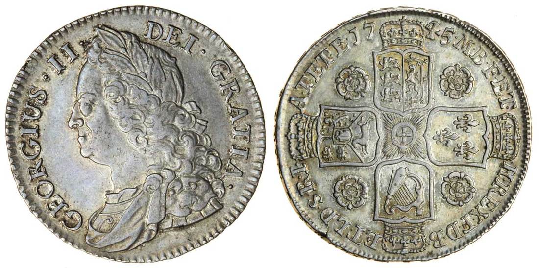 George II (1727-1760), Halfcrown, 1745 d.nono, old laureate and cuirassed bust left, rev. crowned cruciform shields, roses in angles, Garter star at centre (ESC 1685 (604); S.3694), attractively toned, very fine, the reverse better