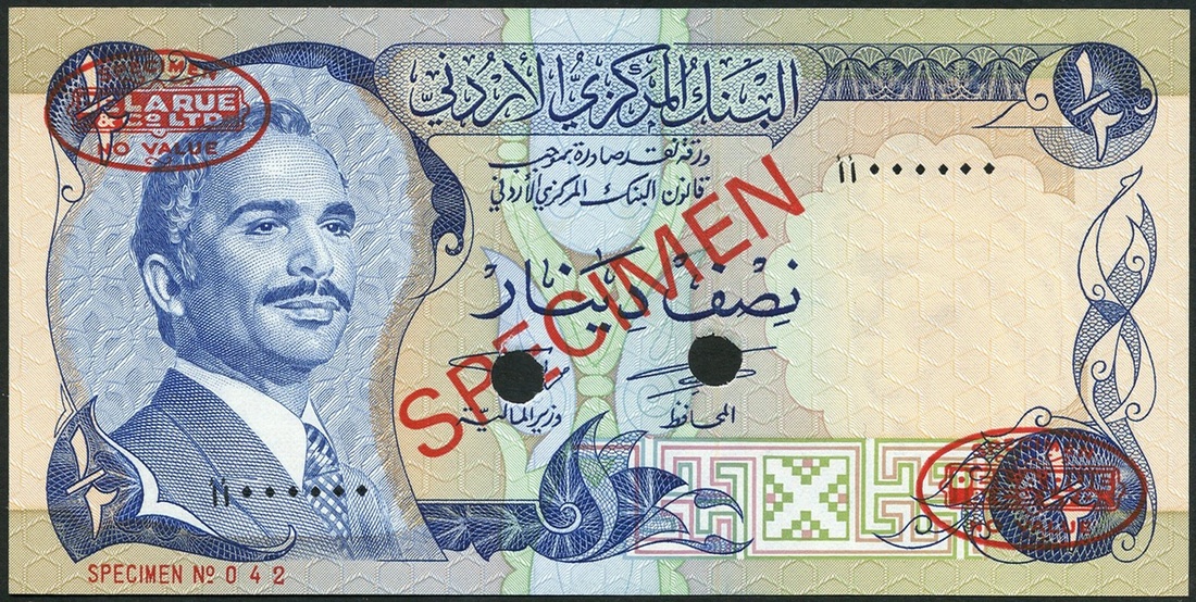 (x) Central Bank of Jordan, specimen ½ Dinar, ND (1977-85 "Second Series" Emergency Issue), serial number AA 000000, blue and multicoloured, portrait of King Hussein at left, reverse Jerash Forum, Mohamad Al Dabbas and