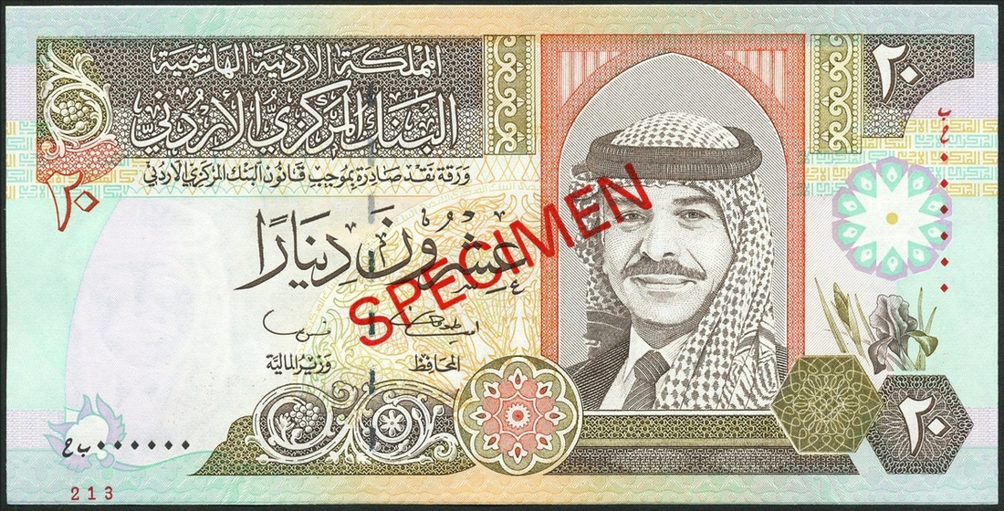 (x) Central Bank of Jordan, specimen 10 dinars, 1996, zero serial number, blue on multicolour, Basel Jardaneh and Ziad Fariz signature, 25 dinars (3), 2001, zero serial number, orange and brown on multicolour, Michael Marto and Umayya Salah Toukan signature, all with King Hussein at right, red SPECIMEN overprint