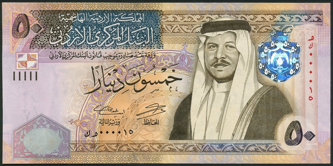 (x) Central Bank of Jordan, a set comprising 1 dinar, 2013, green, 5 dinars, 2010, orange, 10 dinars, 2012, blue, 20 dinars, 2013, green, and 50 dinars, 2012, orange and purple, all with serial number 0000010,