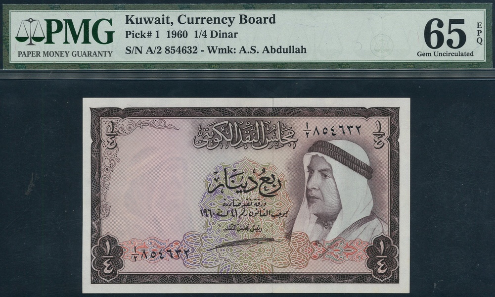 (x) Kuwait Currency Board, 1/4 dinar, 1960, serial number A/2 854632, brown on multicolour underprint, Sheikh Abdullah at right, Jaber Al-Ahmed Al-Sabah signature