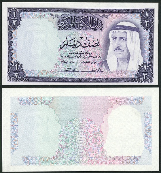 (x) Central Bank of Kuwait, proof 1/2 dinar (2), 1978, first; no serial number purple on multicolour underprint, Sheikh Sabah at right, reverse purple Shuwaikh secondary school building, second; obverse multicolour underprint, reverse purple on multicolour, Shuwaikh secondary school building