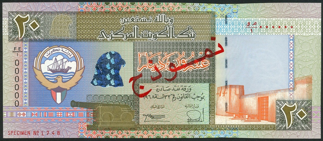 (x) Central Bank of Kuwait, a specimen set of the 5th series, law of 1968 (1994), comprising 1/4 dinar, prefix AE/1, 1/2 dinar, prefix BE/1, 1 dinar, prefix CE/1, 5 dinars, prefix DE/1, 10 dinars, prefix EE/1 and 20 dinars, prefix FE/1, all multicoloured, arms at left, signatures of Salem Abdul Aziz Al-Saud Al-Sabah and Nasir Abdullah al-Rodhan, red Arabic SPECIMEN overprint