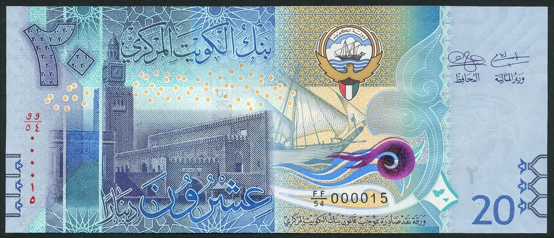 (x) Central Bank of Kuwait, a set from the 2014 issue comprising 1/4 dinar, prefix AF/49, brown, 1/2 dinar, prefix BF/35, green, 1 dinar, prefix CF/57, grey, 5 dinars, prefix DF/25, purple, 10 dinars, EF/57, red-brown, 20 dinars, FF/54, blue, all with serial number 000015