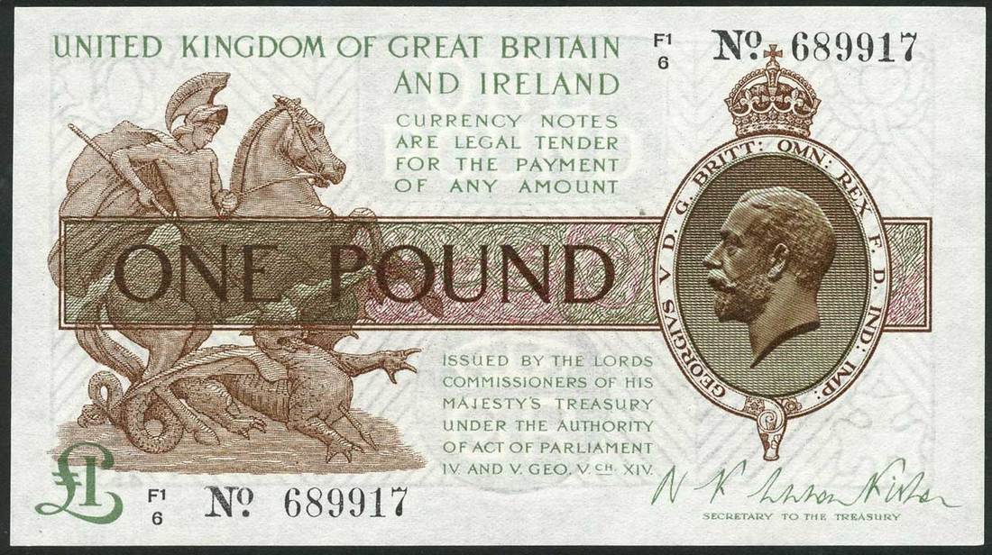 Treasury Series, N F Warren Fisher, £1, ND (1919), serial number R1/34 030002 F1/6 689917 and D1/62 409479, brown and green on white, portrait King George V at right, St George and dragon at left, value in ornate panel at centre