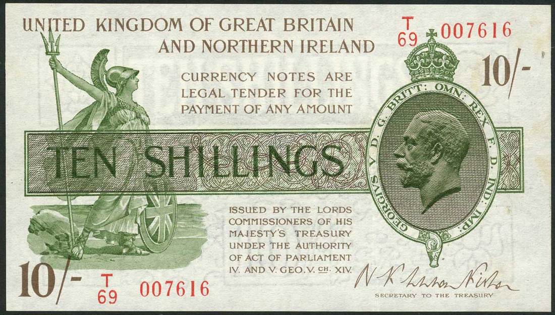 Treasury Series, N F Warren Fisher, 10/-, ND (25 July 1927), serial numbers T/69 007616, and W/55 202157, brown, green and purple, George V at centre right, Britannia at left, value in ornate tablet at centre and at low left and top right