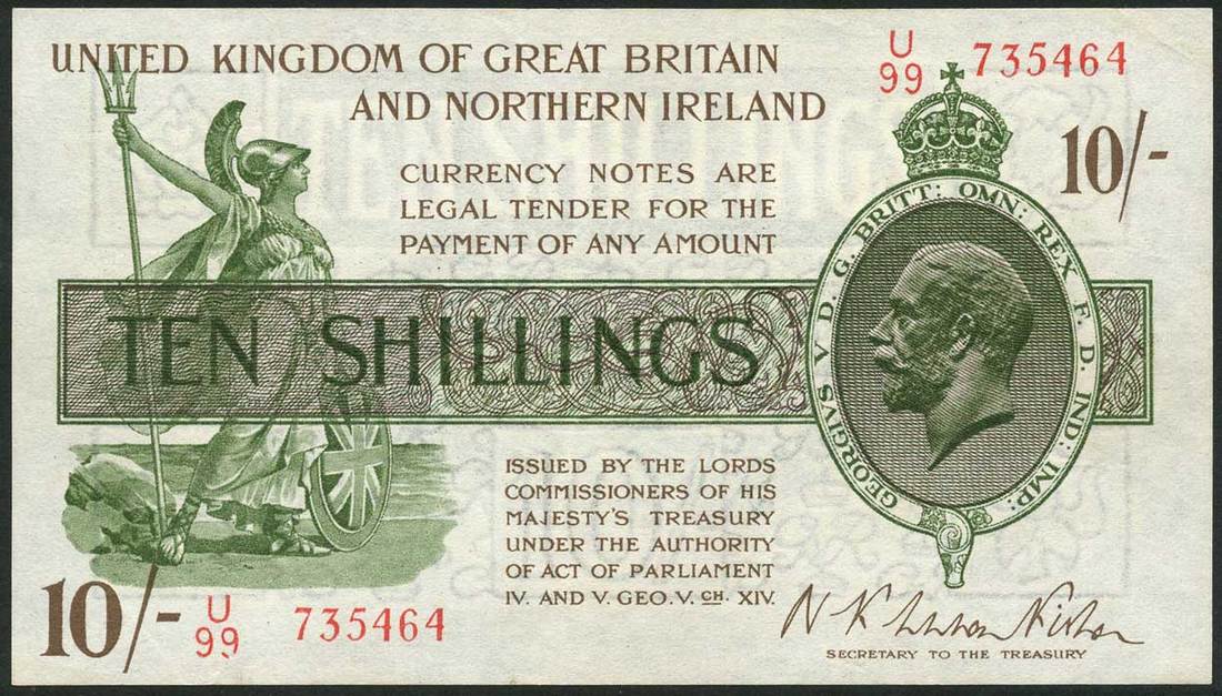 Treasury Series, N F Warren Fisher, 10/-, ND (25 July 1927), serial numbers U/14 322006, U/99 735464 and W/30 721622, brown, green and purple, George V at centre right, Britannia at left, value in ornate tablet at centre and at low left and top right
