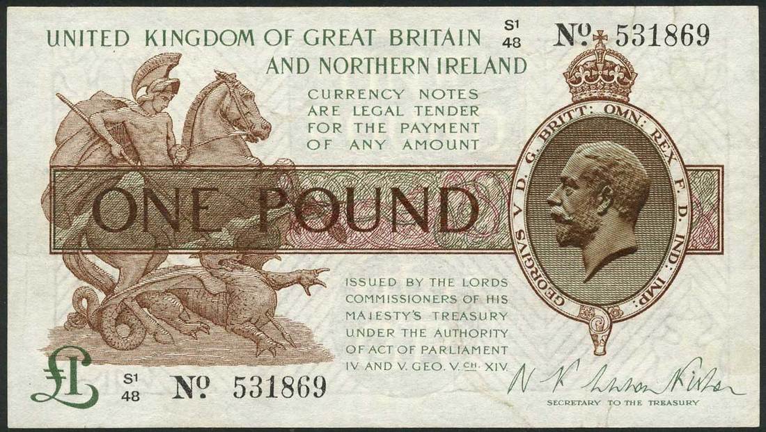 Treasury Series, N.F.Warren Fisher, 10 shillings, ND (1927), prefix T/21, green, lilac and white, Britannia at left, also £1 (2), ND (1927), prefixes S1/48 and X1/13, purple, brown, green and lilac, Saint George and the dragon at left, crowned head of George V at right, reverse the Houses of Parliament at centre, all are NORTHERN IRELAND type