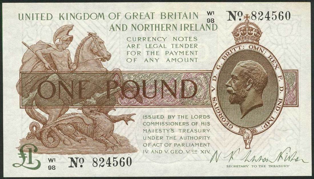 Treasury Series, N F Warren Fisher, £1, ND (1927), serial number W1/33 383325 and W1/98 824560, brown and green on white, portrait King George V at right, St George and dragon at left, value in ornate panel at centre