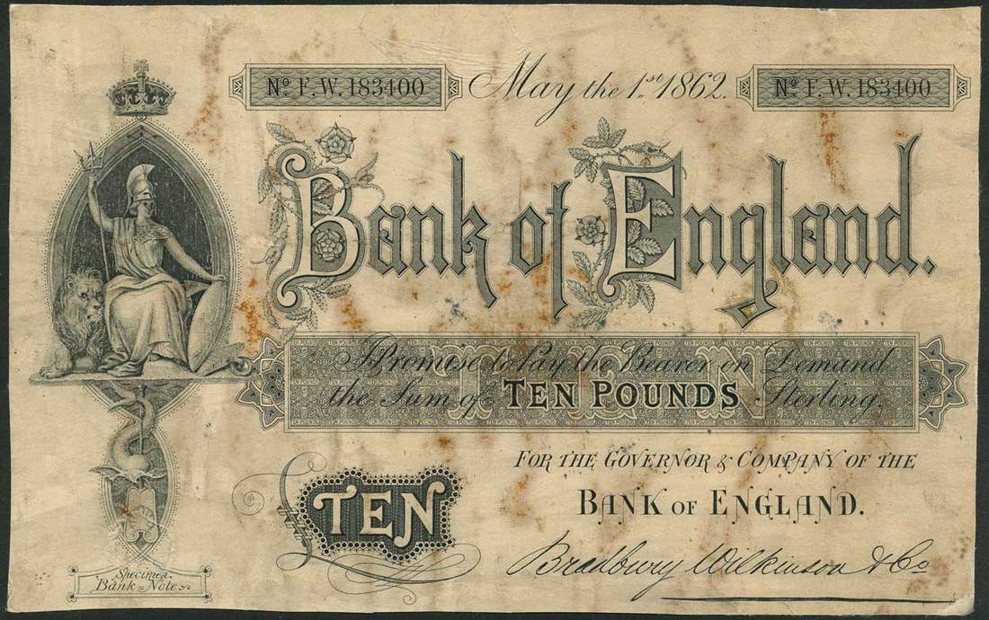 Bradbury, Wilkinson & Co., Bank of England, a trial £10, 1 May 1862, serial number F.W.183400, black and white, Britannia top left, dolphin below
