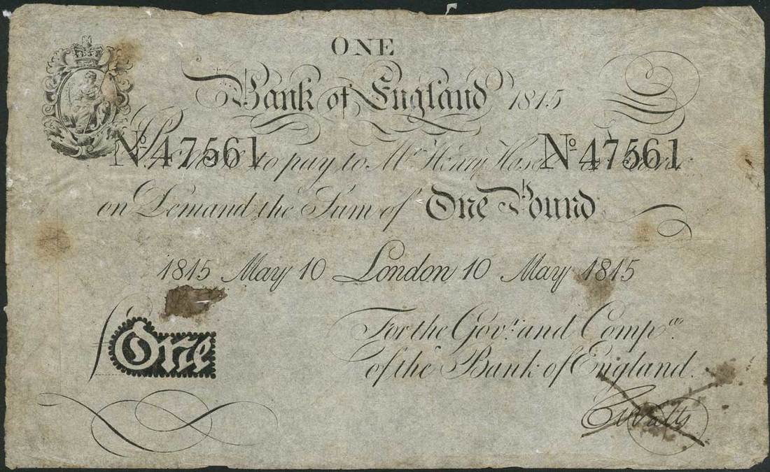 Bank of England, Henry Hase, £1, London, 10 May 1815, serial number 47561, black and white, ornate crowned vignette of Britannia top left, value in black tablet low left, manuscript signature low right