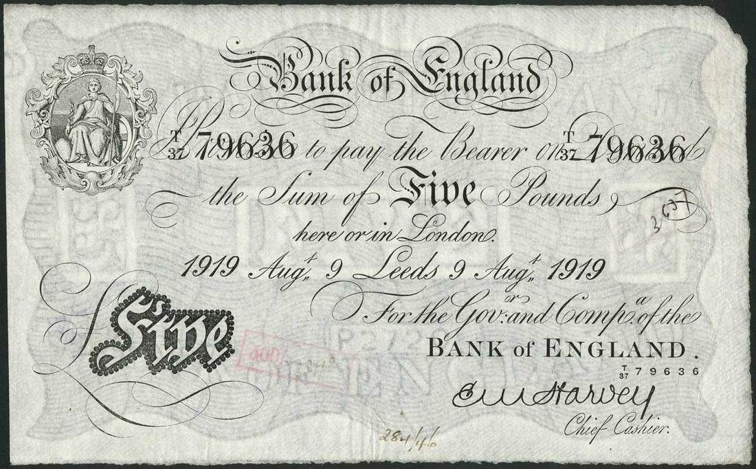 Bank of England, E. M. Harvey, £5, Leeds, 9 August 1919, serial number T/37 79636, black and white, ornate crowned vignette of Britannia top left, value in black tablet low left