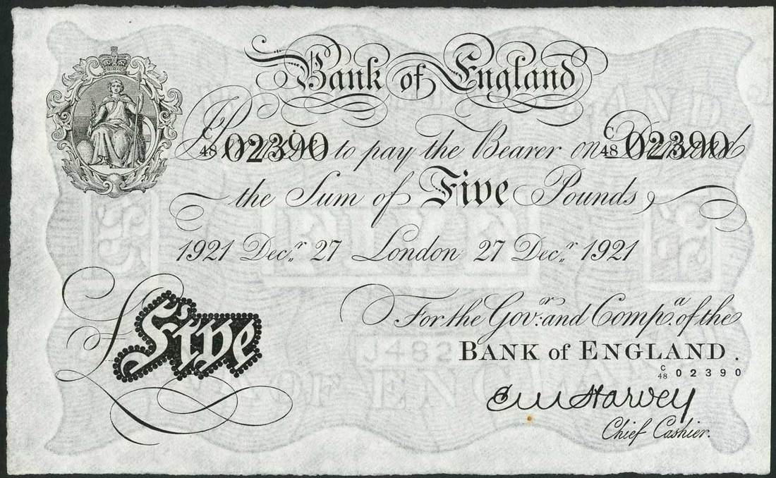 Bank of England, E.M. Harvey, £5, London, 27 December 1921, serial number C/48 02390, black and white, ornate crowned vignette of Britannia at top left, value in black tablet at low left