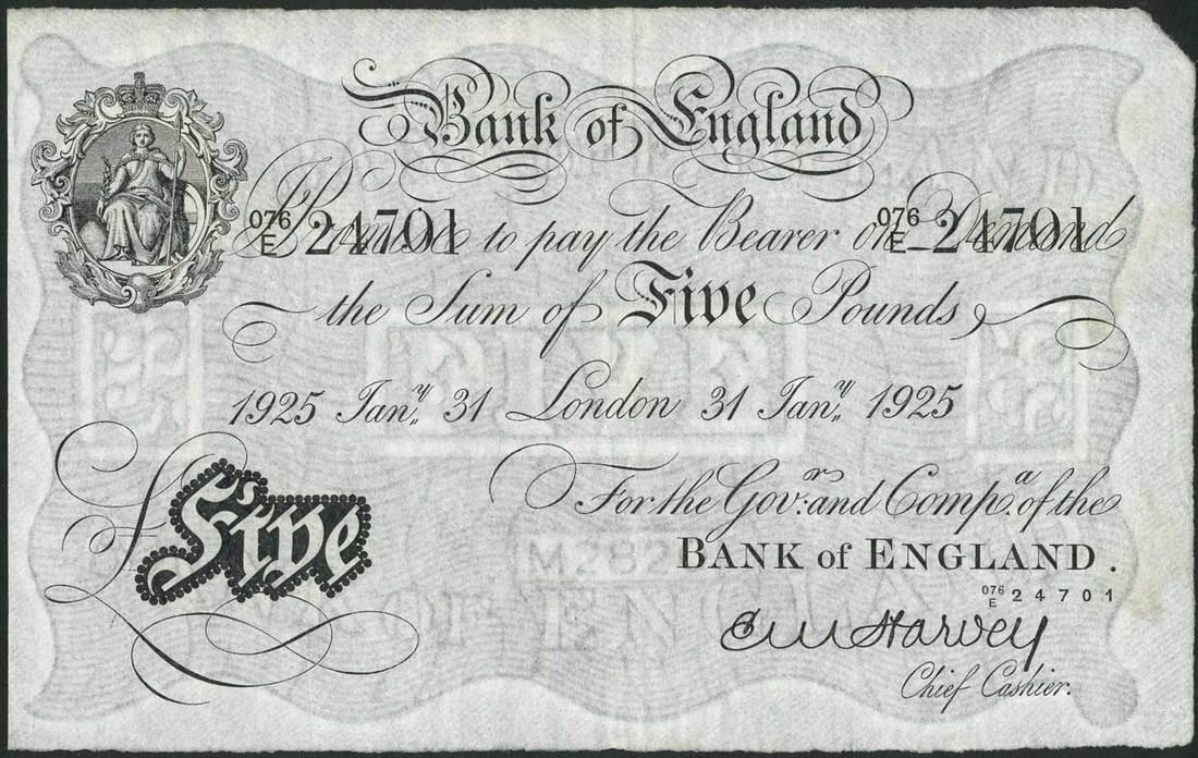 Bank of England, E.M. Harvey, £5, London, 31 January 1925, serial number 076/E 24701, black and white, ornate crowned vignette of Britannia at top left, value in black tablet at low left