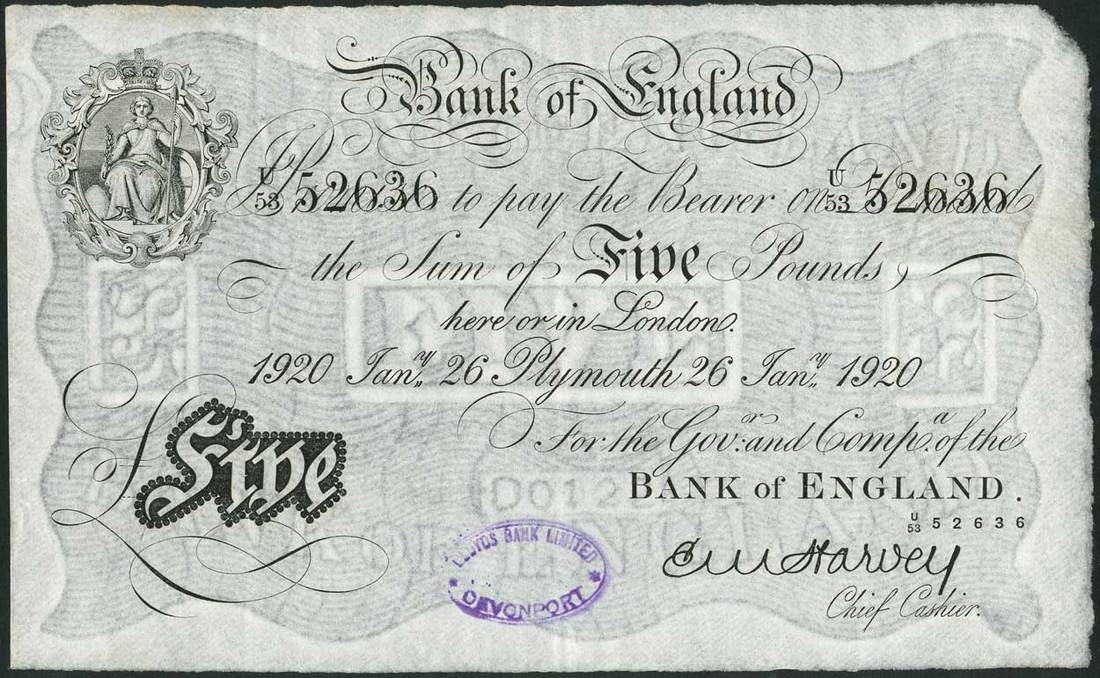 Bank of England, E.M. Harvey, £5, Plymouth, 26 January 1920, serial number U/53 52636, black and white, ornate crowned vignette of Britannia at top left, value in black tablet at low left