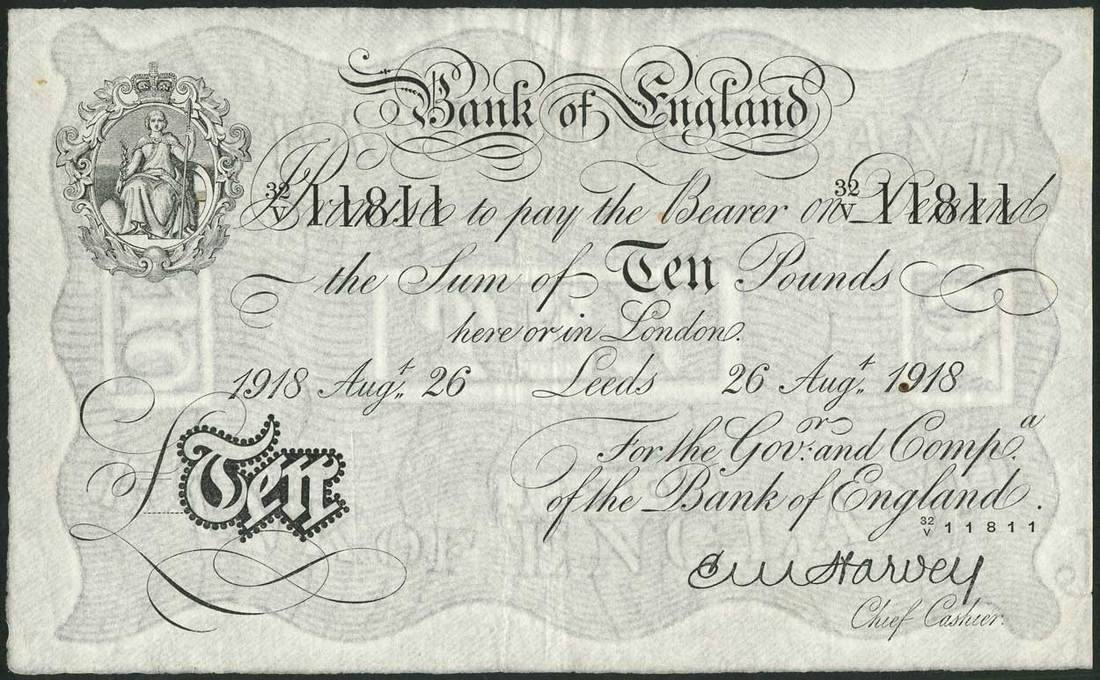 Bank of England, E.M. Harvey, £10, Leeds, 16 August 1918, serial number 32/V 11811, black and white, ornate crowned vignette of Britannia at top left, value in black tablet at low left