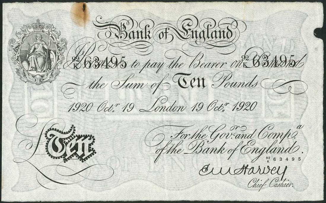 Bank of England, E M Harvey, £10, London, 19 October 1920, serial number 92/K 63495, black and white, seated Britannia in elaborate frame top left, value in ornate black tablet low left, bank title top centre