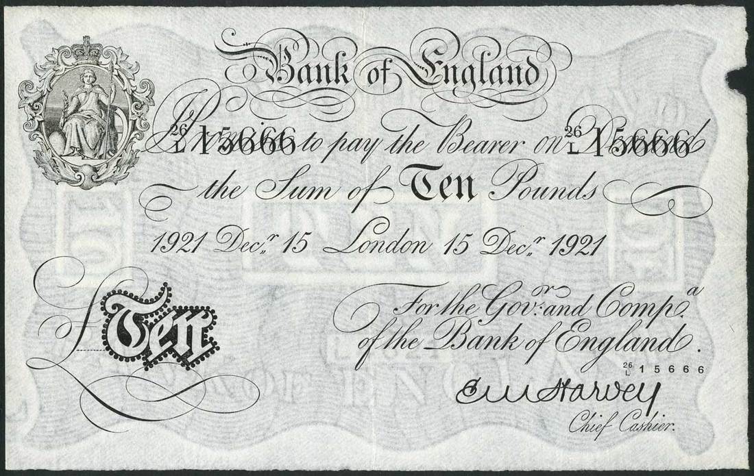 Bank of England, E.M. Harvey, £10, London, 15 December 1921, serial number 26/L 15666, black and white, ornate crowned vignette of Britannia at top left, value in black tablet at low left