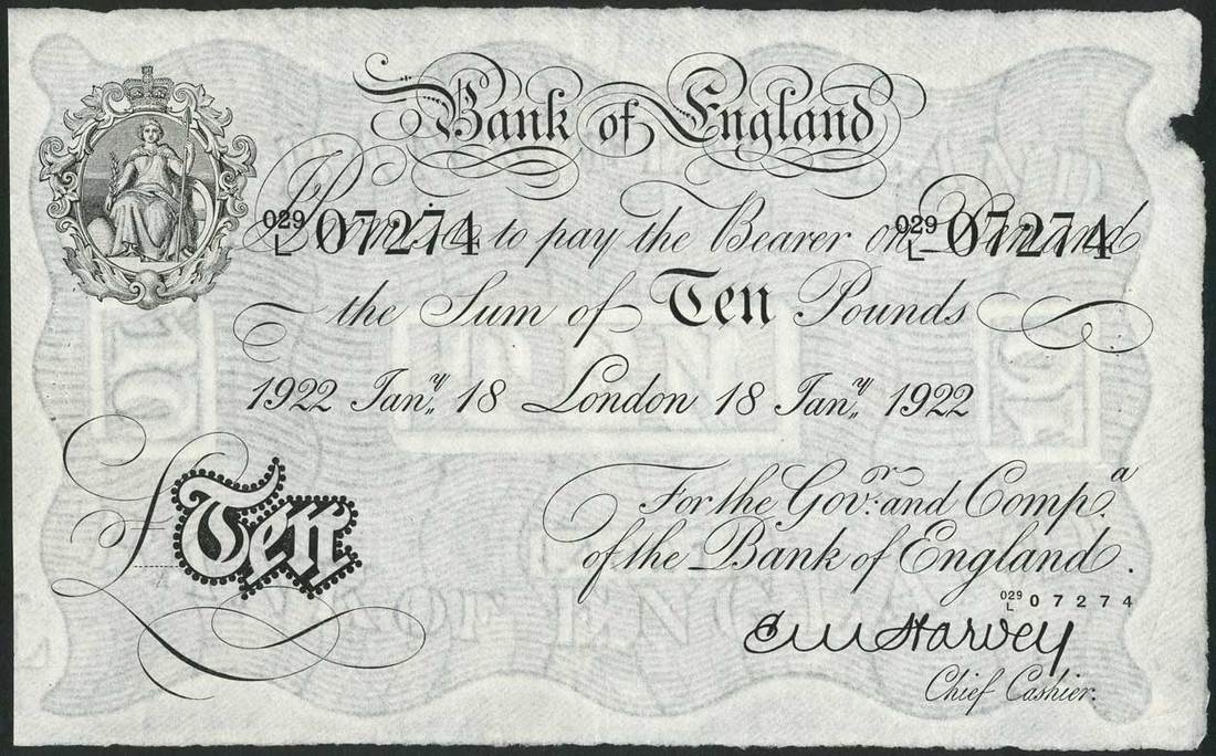 Bank of England, E.M. Harvey, £10, London, 18 January 1922, serial number 029/L 07274, black and white, ornate crowned vignette of Britannia at top left, value in black tablet at low left