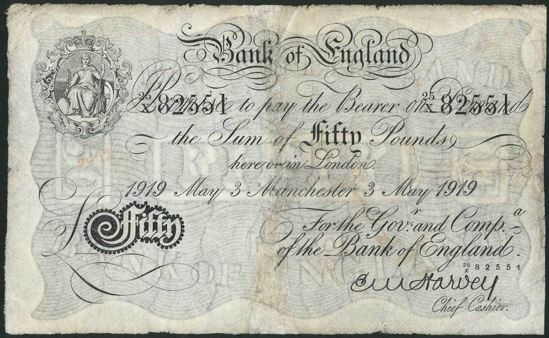 Bank of England, E.M.Harvey, £50, Manchester, 3 May 1919, serial number 25/X 82551, black and white, ornate crowned vignette of Britannia top left, value in black tablet low left