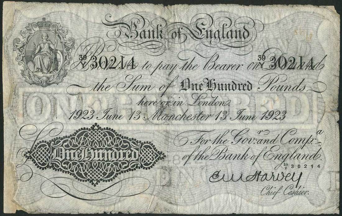 Bank of England, E.M.Harvey, £100, Manchester, 13 June 1923, serial number 39/Y 30214, black and white, ornate crowned vignette of Britannia top left, value in black tablet low left