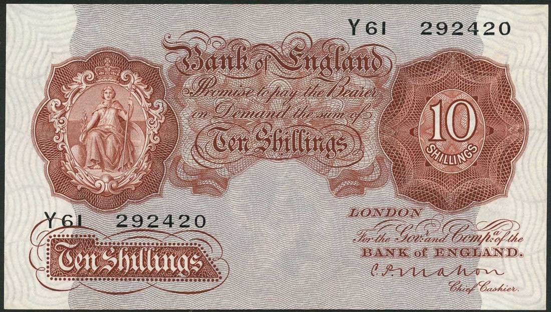 Bank of England, C P Mahon, 10/-, ND (1928), serial number Y 61 292420 and Y78 618946, red-brown, crowned Britannia at right, value in guilloche at left and in panel low left