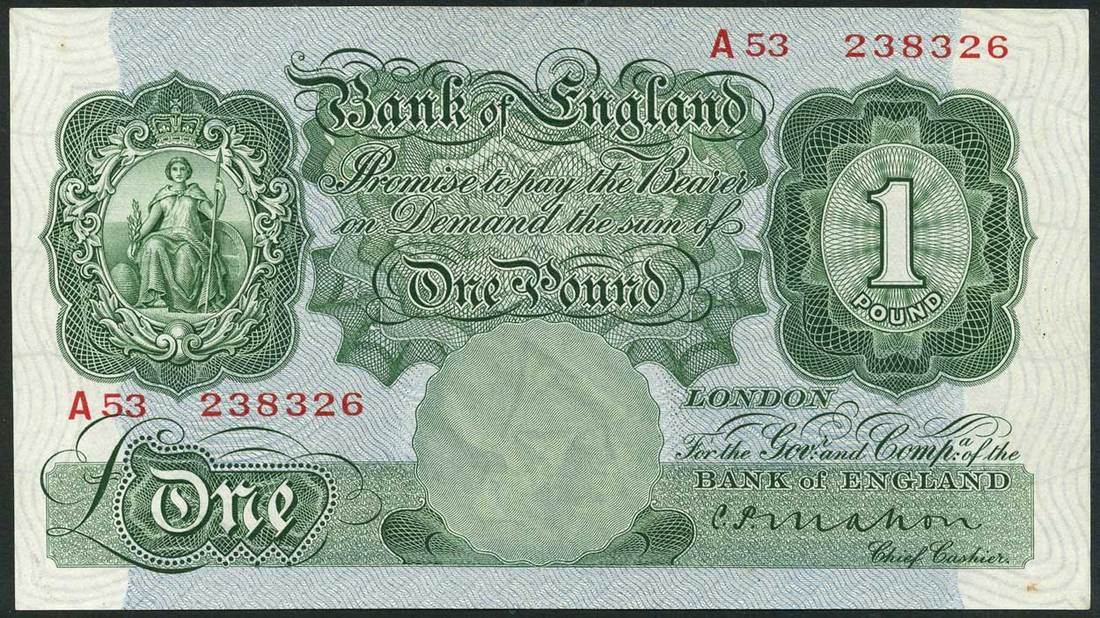 Bank of England, C P Mahon, £1 (2), ND (1928), serial numbers A/53 238326 and C81 615495, green and pale blue, seated Britannia in ornate circular frame at left, value in tablet low left and at right, bank title top centre, reverse, bank building top centre, St George and dragon at left and right