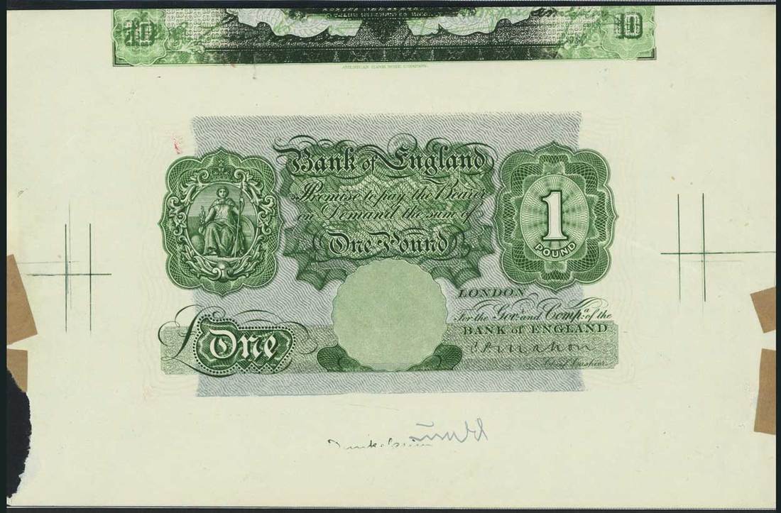 Bank of England, C.P.Mahon, lithographic proof on large format paper for £1, ND (c.1928), green, Britannia at top left, value at top right and low left, with portion of another note printed above