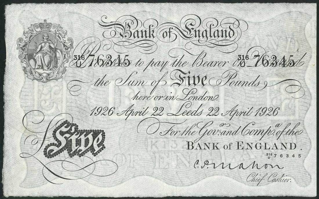 Bank of England, C.P.Mahon, £5, Leeds, 22 April 1926, serial number 316/U 76345, black and white, ornate crowned vignette of Britannia at top left, value in black tablet at low left