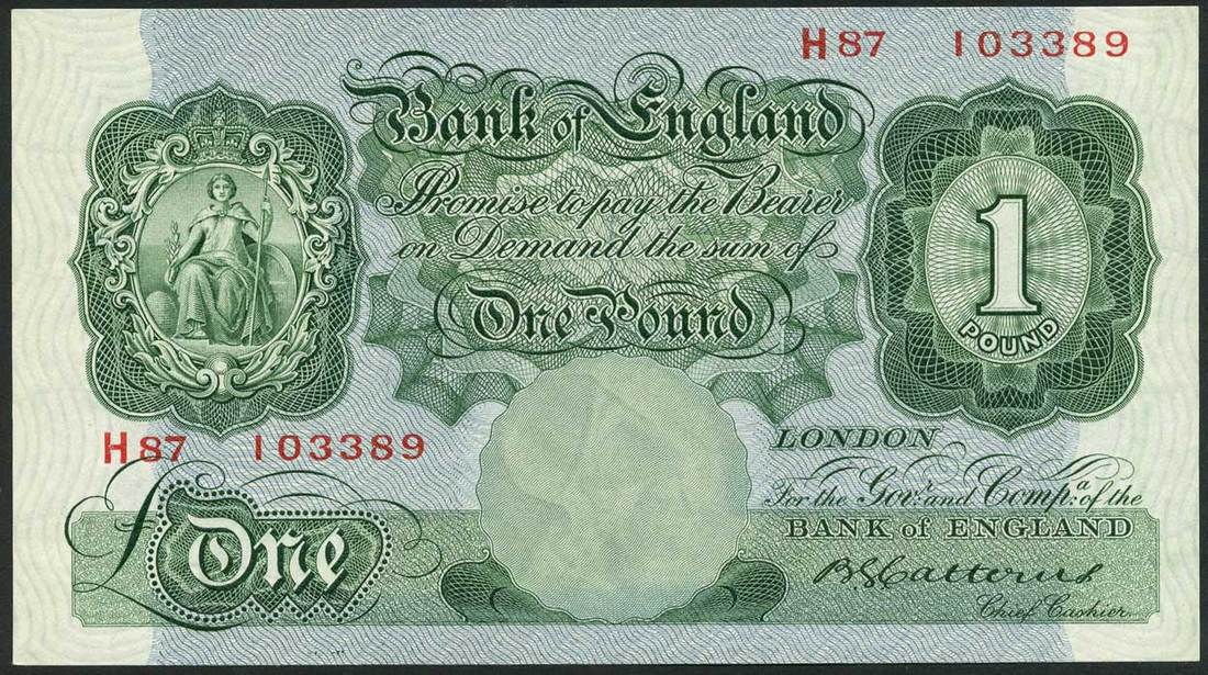 Bank of England, B G Catterns, £1 (2), ND (1930), serial numbers H87 103389 and X91 153213, green and pale blue, seated Britannia in ornate circular frame at left, value in tablet low left and at right, bank title top centre, reverse, bank building top centre, St George and dragon at left and right