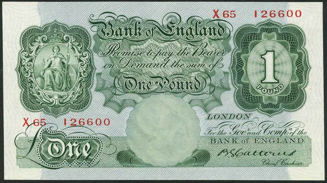 Bank of England, B.G.Catterns, £1 (6), ND (1930), prefixes R,X,Y (2),Z (2), green and pale blue, ornate crowned vignette of Britannia at left, value at right