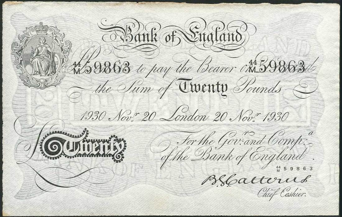 Operation Bernhard, B.G.Catterns, £10, London, 19 February 1922, prefix K/102, and £20, London, 20 November 1930, prefix 44/M, black and white, ornate crowned vignette of Britannia at top left, value in black tablet at low left