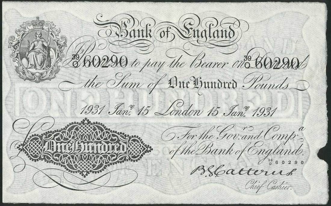 Bank of England, B G Catterns, £100, London, 15 January 1931, serial number 39/0 60290, black and white, seated Britannia in elaborate frame top left, value in ornate black tablet low left, bank title top centre