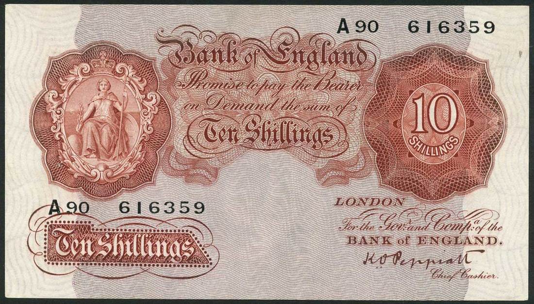 Bank of England, K O Peppiatt, 10/- (2), ND (1934), serial number J93 435251 and A90 616359, red-brown, crowned Britannia at right, value in guilloche at left and in panel low left