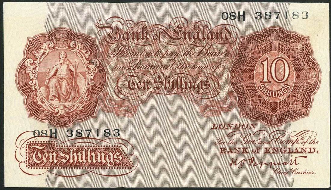 Bank of England, K O Peppiatt, a group of eight 10/-, ND (1934), prefixes 08H, 87S, 66L21H, 20O, 93U, 62U, 73L, red-brown, crowned Britannia at right, value in guilloche at left and in panel low left