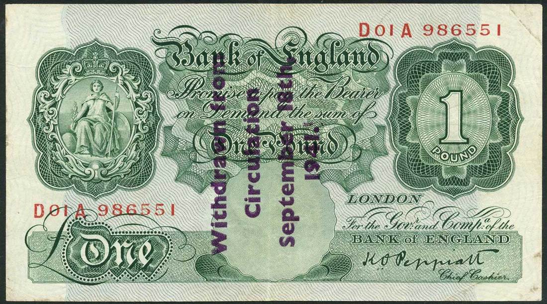States of Guernsey overprints, K O Peppiatt, £1, 1941, serial number D01A 986551, green, Britannia at left, value at right, purple overprint 'Withdrawn from circulation September 18th 1941..' at centre