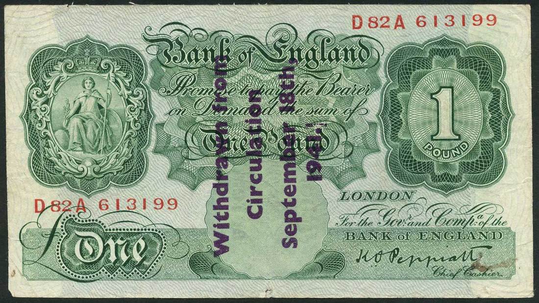 States of Guernsey overprints, K.O.Peppiatt, £1, 1941, serial number D82A 613199, green, Britannia at left, value at right, purple overprint 'Withdrawn from circulation September 18th, 1941.' at centre