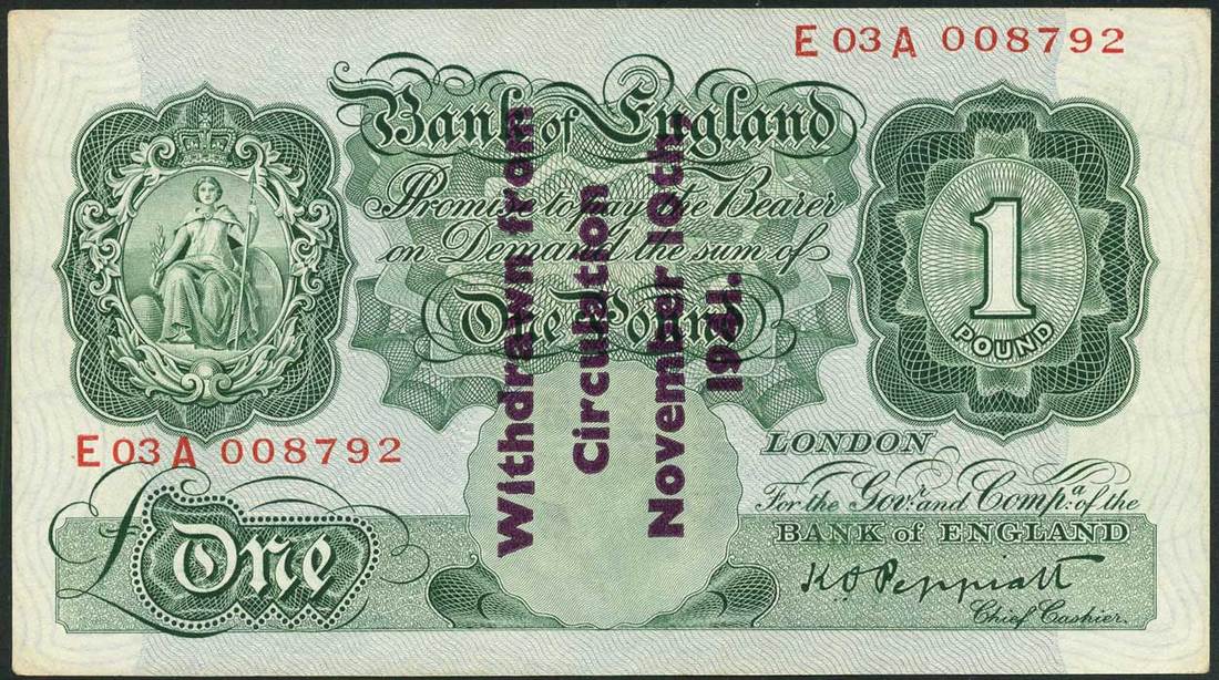 States of Guernsey overprints, K O Peppiatt, £1, 1941, serial number E03A 008792, green, Britannia at left, value at right, purple overprint 'Withdrawn from circulation November 10th 1941.' at centre