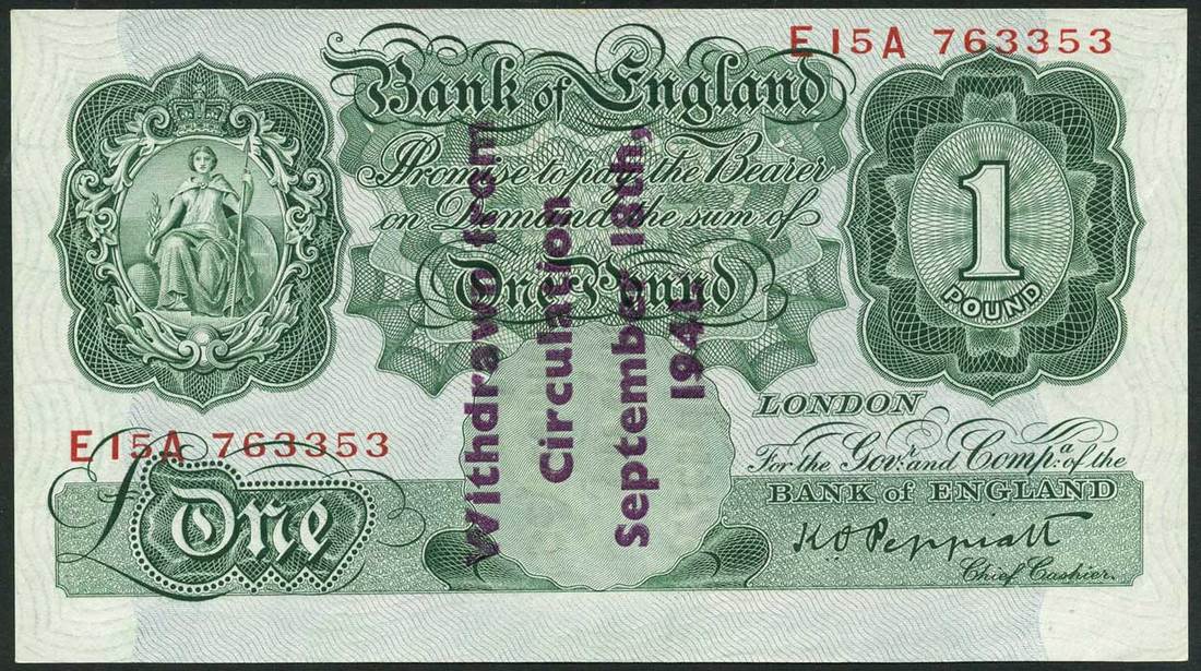 States of Guernsey overprints, K O Peppiatt, £1, 1941, serial number E15A 763353, green, Britannia at left, value at right, purple overprint 'Withdrawn from circulation September 18th 1941.' at centre