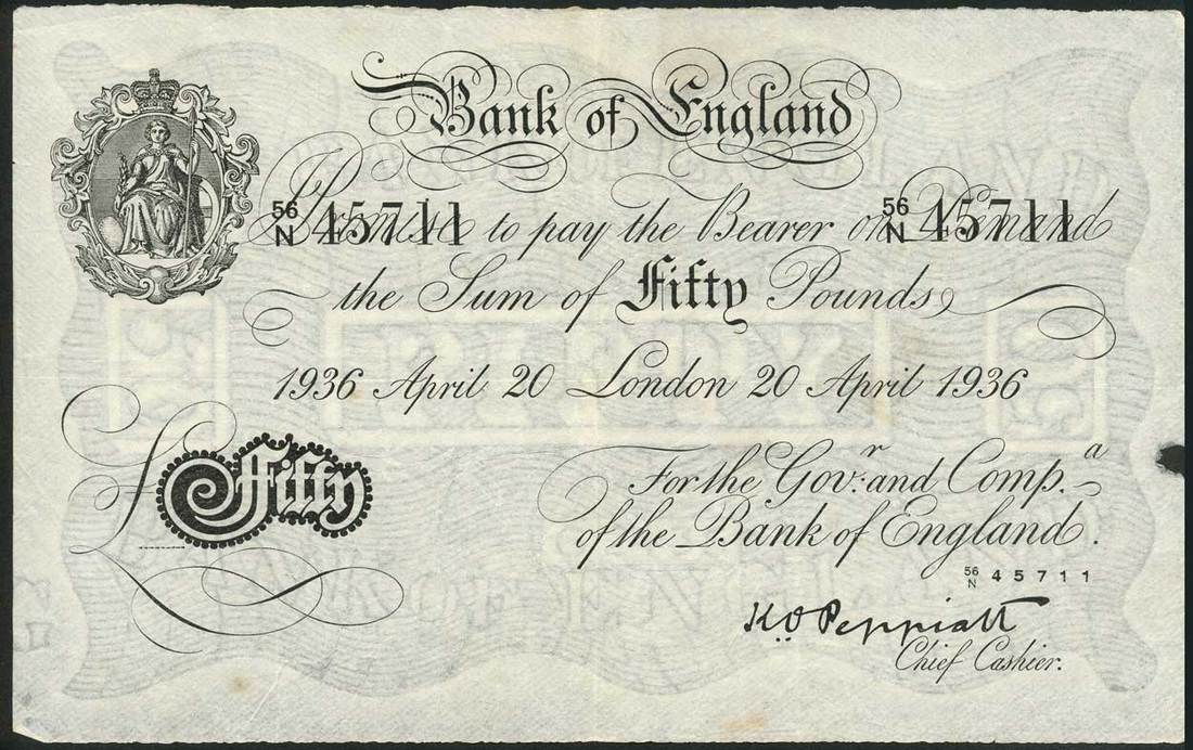 Operation Bernhard, a group comprising B.G.Catterns £20 (2), 1930, prefixes 43/M, £50, 1933, prefix 50/N, K.O.Peppiatt, £5 (3), London, 1934 prefix A/134, 1936 prefix A/317, 1937, A/374, £10, London, 1934 prefix K/134, 1936 prefix K/171, £20, London, 1937 prefix 54M, and two contemporary forgeries, all black and white, ornate crowned vignette of Britannia top left, value in black tablet low left