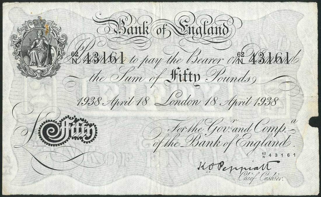 Bank of England, K.O.Peppiatt, £50, London, 18 April 1938, serial number 62/N 43161, black and white, ornate crowned vignette of Britannia at top left, value in black tablet at low left