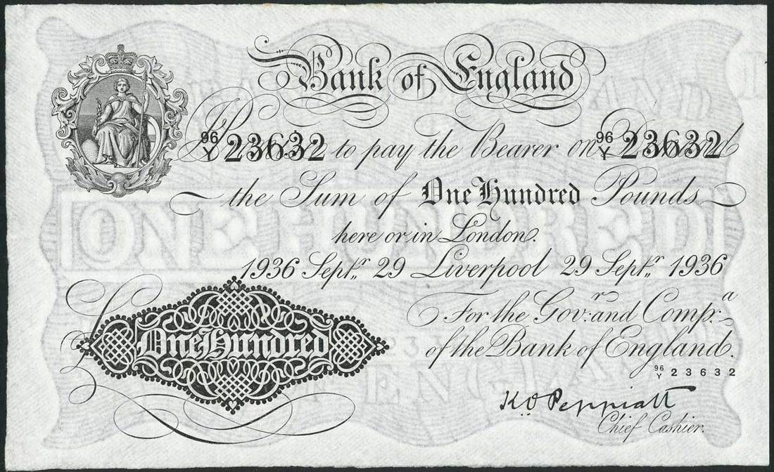 Bank of England, K O Peppiatt, £100, Liverpool, 29 September 1936, serial number 96/Y 23632, black and white, seated Britannia in elaborate frame top left, value in ornate black tablet low left, bank title top centre