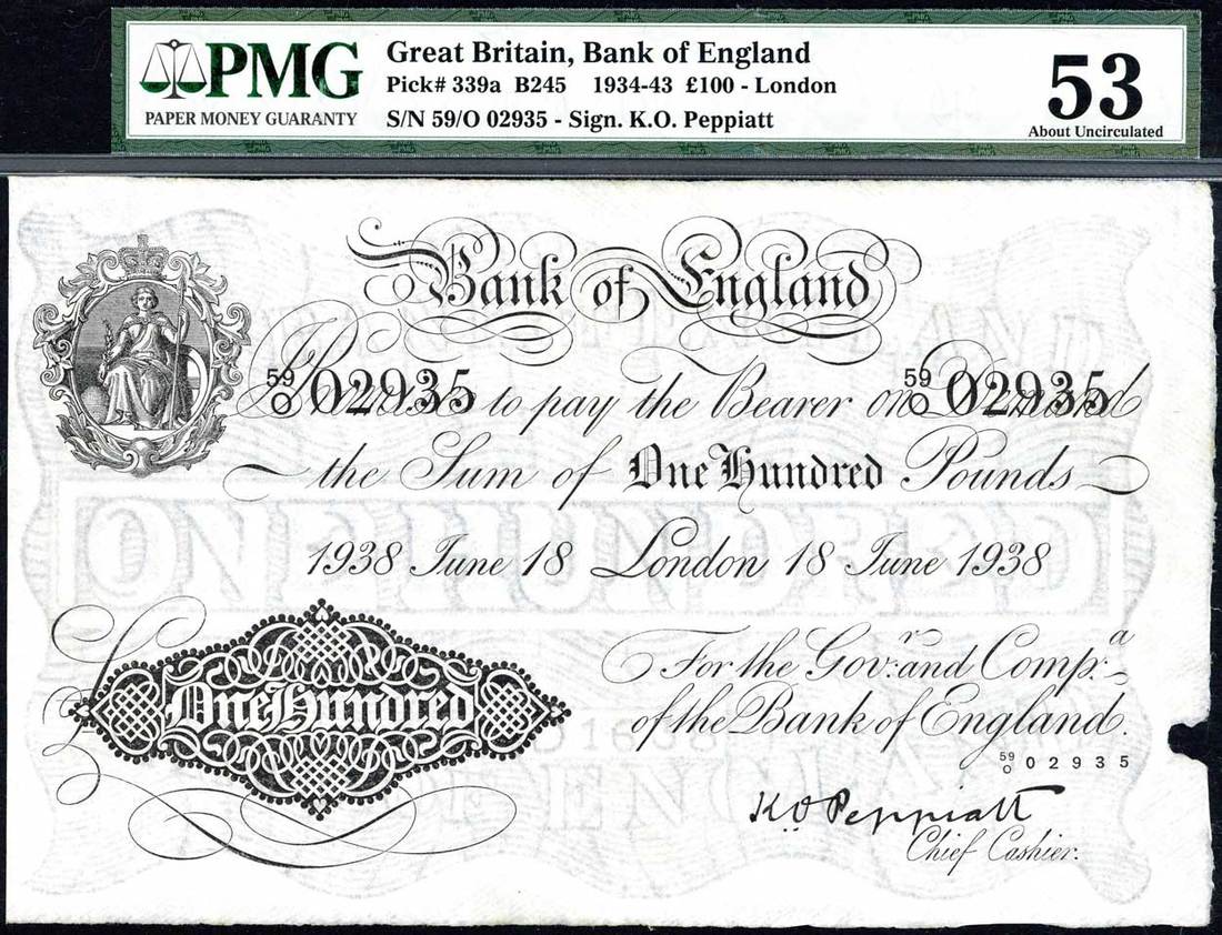 Bank of England, K O Peppiatt, £100, 18 June 1938, serial number 59/O 02935, black and white, seated Britannia top left, bank title top centre, value in ornate black tablet low left