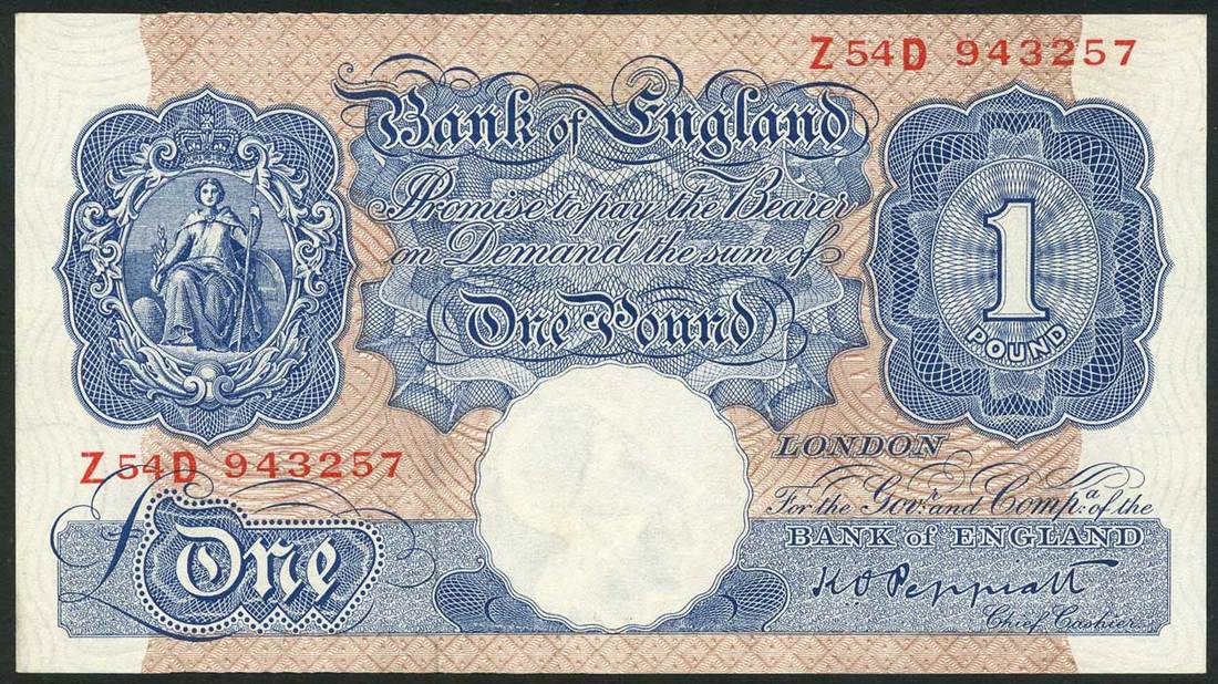Bank of England, K O Peppiatt, £1 (13), ND (1940), prefixes C05D, D20D, E12D (2), S03D, U27D, U32D, Y96D, Z03D, Z17D (3), Z54D, blue and pink, seated Britannia at left, value low left, centre and top right, reverse, blue and brown, bank building top centre