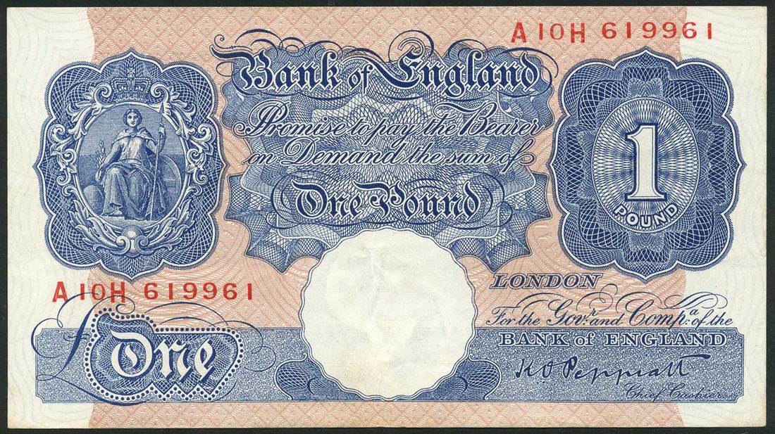 Bank of England, K O Peppiatt, £1 (2), ND (1940), serial numbers A10H 586884, A10H 619961, blue and pink, seated Britannia at left, value low left, centre and top right, reverse, blue and brown, bank building top centre