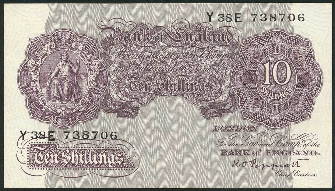 Bank of England, K O Peppiatt, 10/- (3), ND (1940), prefixes O39D, A72D, Y38E, mauve, crowned Britannia at right, value in guilloche at left and in panel low left