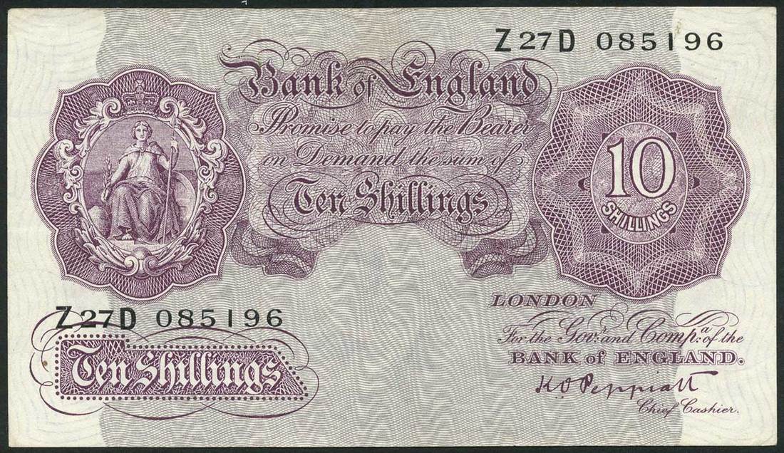 Bank of England, K O Peppiatt, 10/- (6), ND (1940), prefixes A13D, A92D, H98D, U93D, S94D, Z27D mauve, crowned Britannia at right, value in guilloche at left and in panel low left