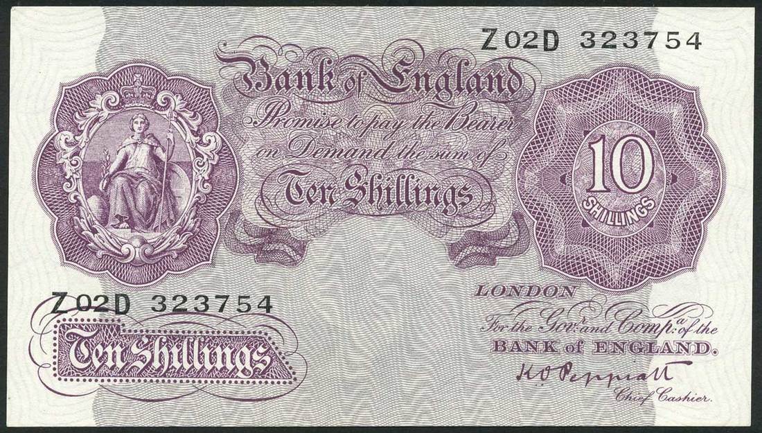 Bank of England, K.O.Peppiatt, 10/-, ND (1940), serial number Z02D 323754, mauve, Britannia at top left, value at top right and low left